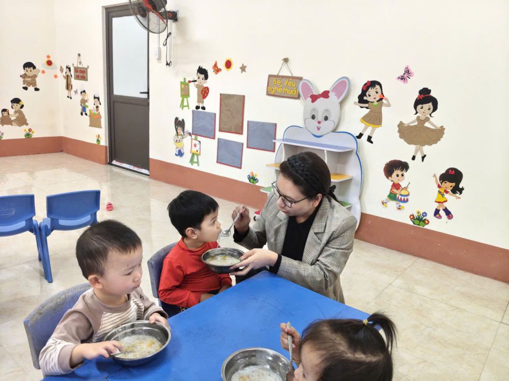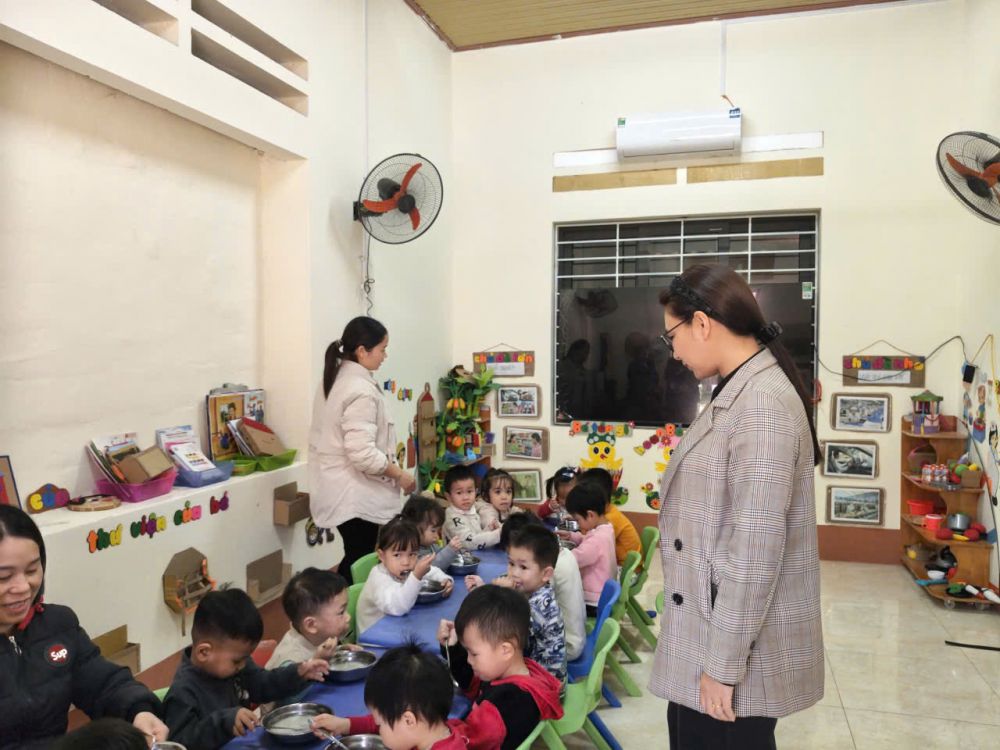 Trong khuôn khổ buổi thăm nắm tình hình chăm sóc – nuôi dưỡng tại Trường Mầm non, đồng chí Chủ tịch UBND xã đã trực tiếp vào lớp dự giờ ăn của trẻ, trực tiếp tham gia công tác chăm sóc trẻ trong giờ ăn quà chiều tại lớp Nhà trẻ và lớp 3-4 tuổi.