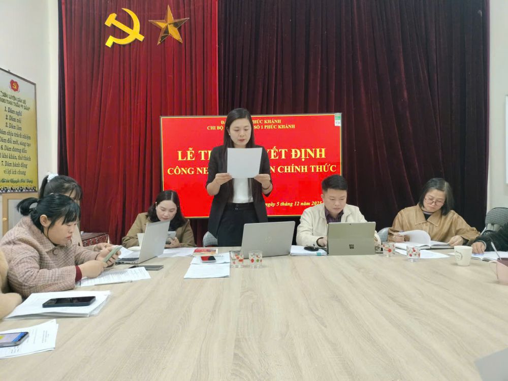 Phần 1: Trao quyết định chuyển đảng chính thức cho đồng chí Hoàng Thị Khánh Nhung. Đồng chí Nguyễn Phương Nga - Bí thư chi bộ nhà trường thông qua quyết định chuyển đảng chính thức và mời đồng chí Lò Tiến Hữu – Uỷ viên Ban thường vụ Đảng uỷ - Trưởng Ban Xây dựng Đảng xã Phúc Khánh lên trao quyết định cho đồng chí Nhung. Tăng số lượng đảng viên chính thức của chi bộ là 19/19 đồng chí.
