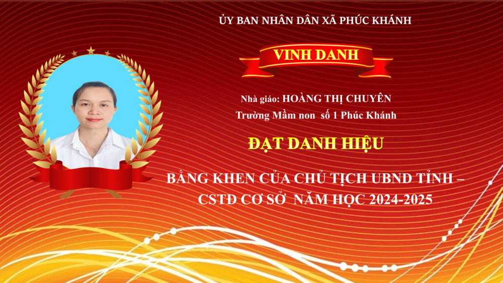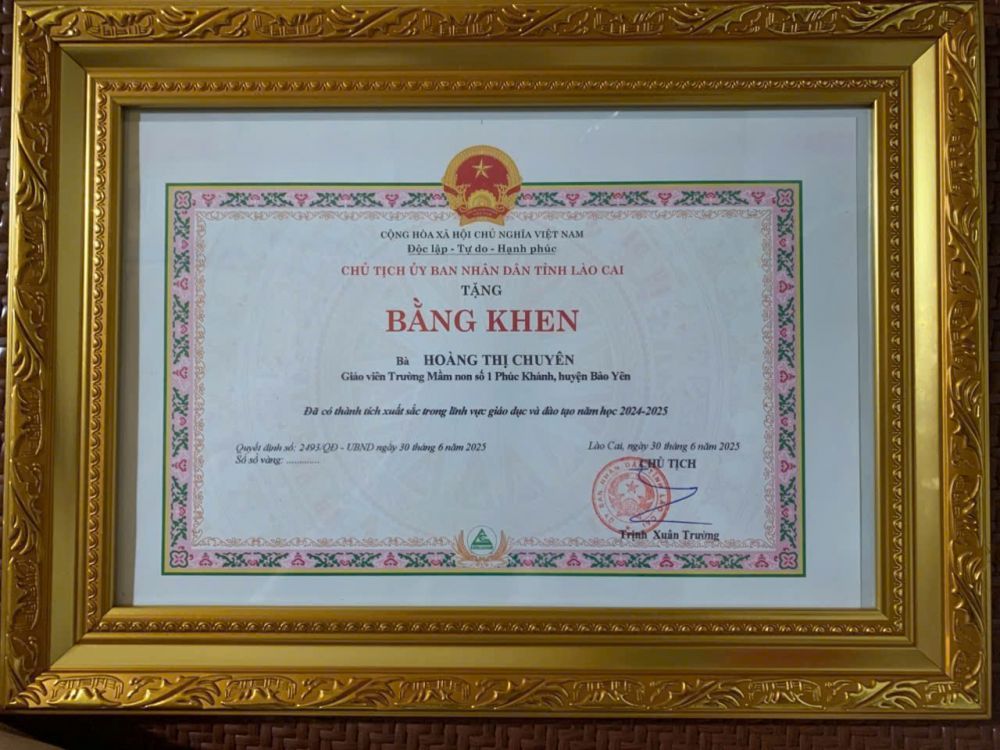Với những nỗ lực bền bỉ và kết quả đạt được trong nhiều năm liền, cô Hoàng Thị Chuyên đã vinh dự được Chủ tịch UBND tỉnh Lào Cai tặng Bằng khen – phần thưởng cao quý ghi nhận những đóng góp xuất sắc của cô đối với sự nghiệp giáo dục địa phương. Đây không chỉ là niềm vinh dự của cá nhân cô mà còn là niềm tự hào chung của tập thể nhà trường.