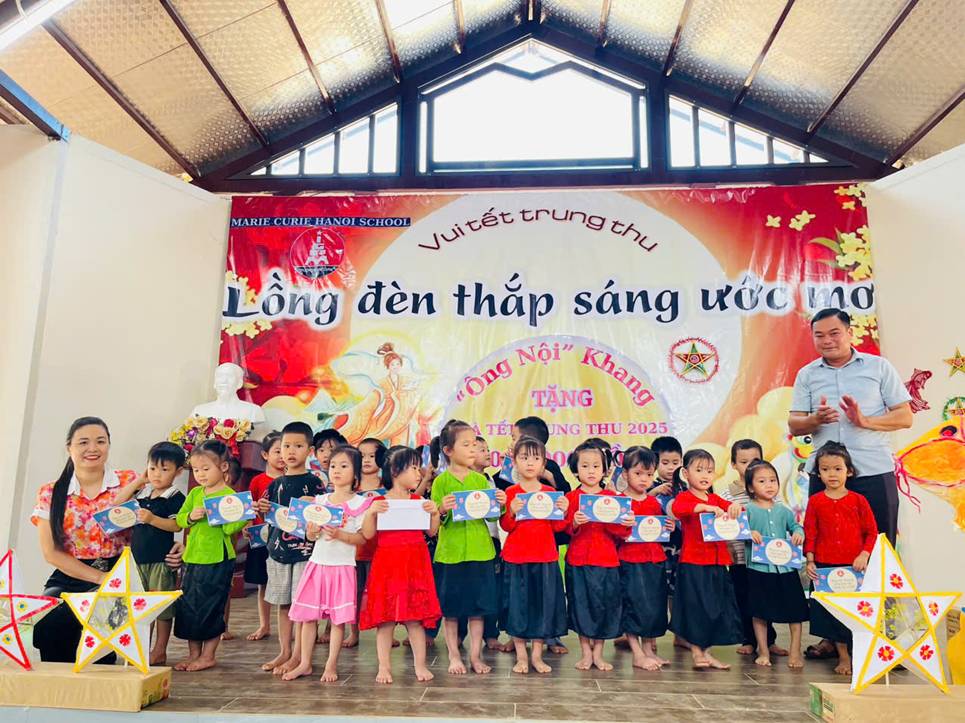 Đặc biệt, trong dịp ý nghĩa này, thầy giáo Nguyễn Xuân Khang – Hiệu trưởng Trường Marie Curie đã gửi tặng 10 triệu đồng để hỗ trợ và chia sẻ niềm vui Trung thu cùng các em học sinh điểm trường Làng Nủ. Đây là món quà vô cùng quý giá, thể hiện tấm lòng nhân ái và sự quan tâm sâu sắc của thầy dành cho trẻ em vùng cao còn nhiều khó khăn.